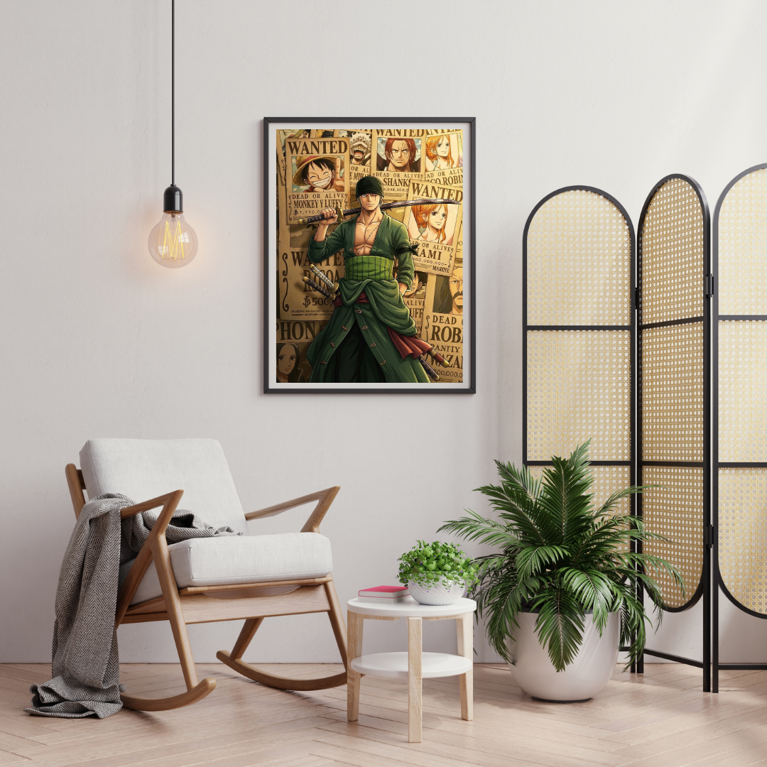 Fearless, focused, and forged by countless battles — Blade of the Bounty Seas is a powerful wall poster inspired by the spirit of legendary anime pirates and master swordsmen. Featuring a stoic warrior standing tall against a backdrop of vintage bounty posters, this artwork embodies honor, strength, and unwavering resolve.