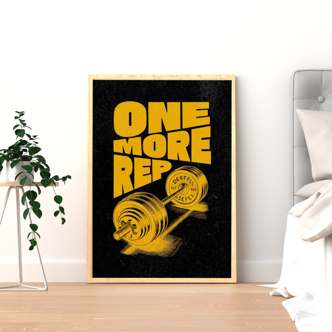 Featuring bold yellow typography on a deep black textured background, this poster captures the raw energy of the gym mindset. The striking dumbbell illustration paired with the iconic phrase “One More Rep” serves as a powerful reminder that progress is built one extra effort at a time. Designed to motivate at a glance, it turns any wall into a source of drive and determination.