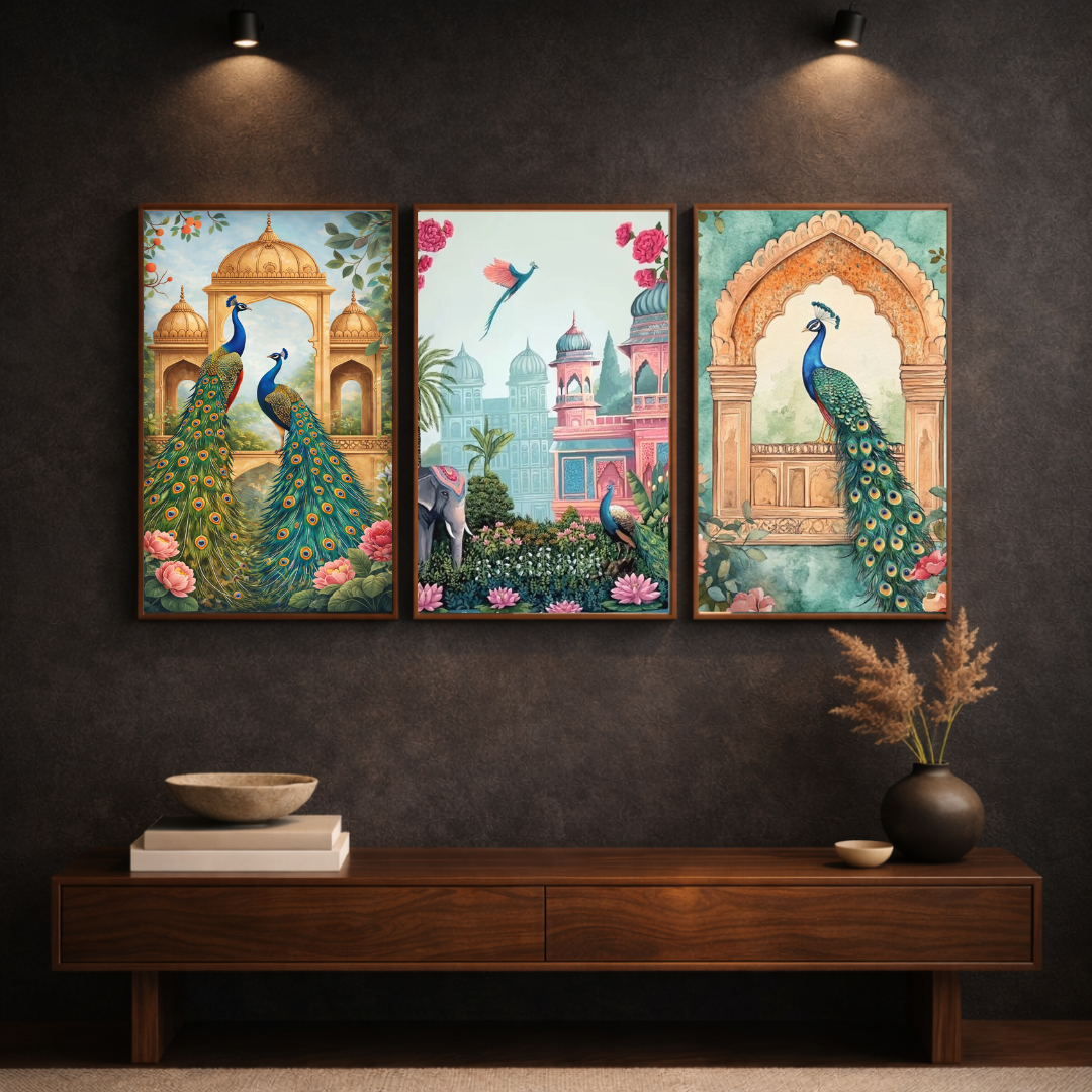 - 🦚 3-Piece Coordinated Artwork Set – A harmonious blend of nature, architecture, and Indian artistry