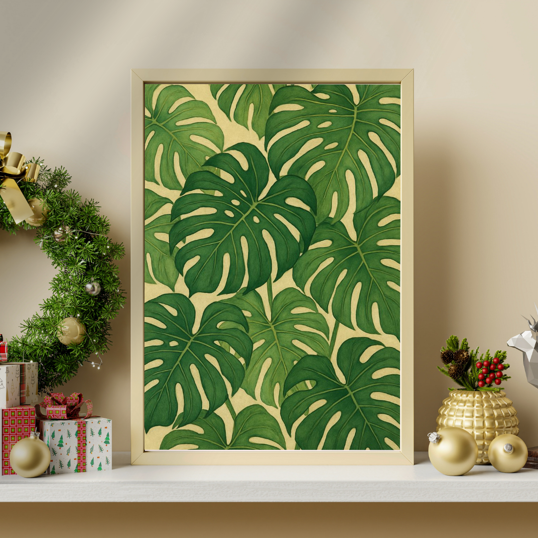 Infuse your space with calm, freshness, and timeless tropical charm with the Tropical Monstera Leaves Framed Poster by Chilekotha. Featuring a lush pattern of hand-illustrated monstera leaves layered in rich, soothing greens, this artwork celebrates nature in its most elegant form.