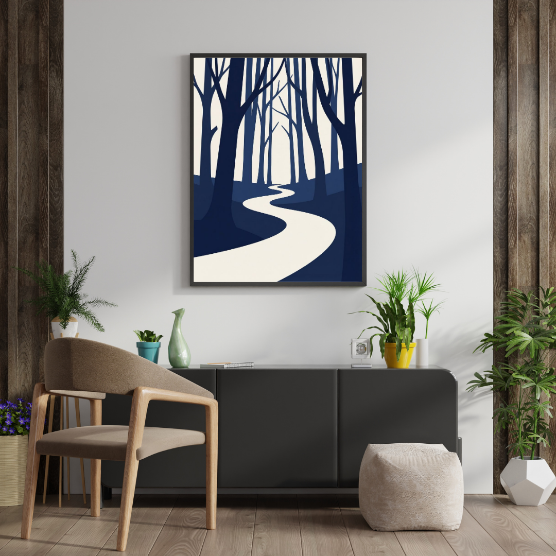 This minimalist artwork portrays a gently curving white path cutting through a forest of deep navy-blue trees. The simplified silhouettes and limited color palette create a serene atmosphere, drawing the eye forward into the distance. The winding road symbolizes movement without rush, direction without pressure, making this piece both visually soothing and emotionally grounding.